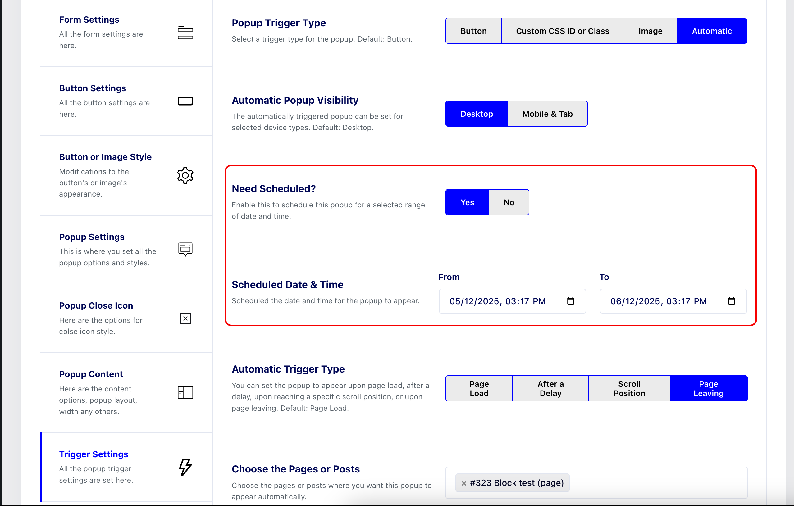 Selected pages can have pop-ups activated upon load, exit, or scroll.